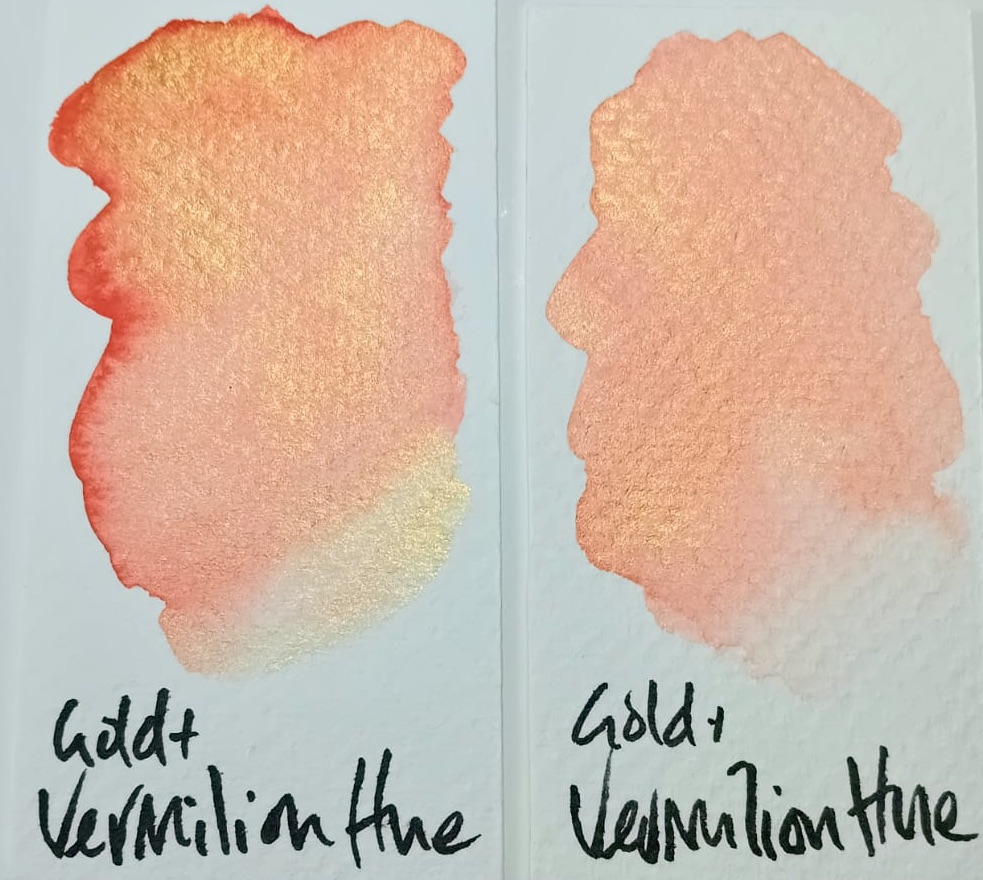 On the right, I tried something gentler. I used a mixing palette to blend the metallics with colour before brushing onto paper. These swatches created a subtle tint to the colour. The shimmer is quieter and more integrated with less opacity to the metallic.